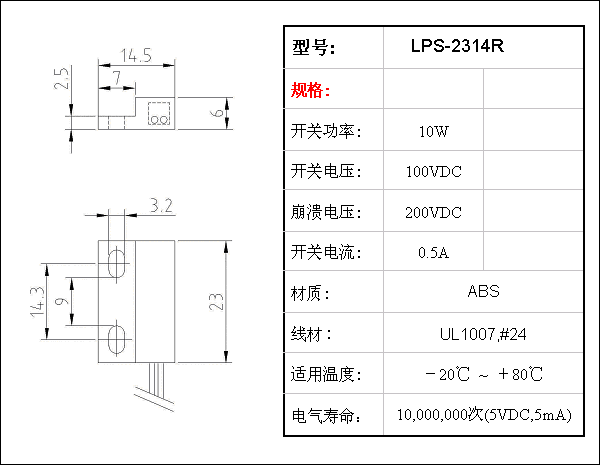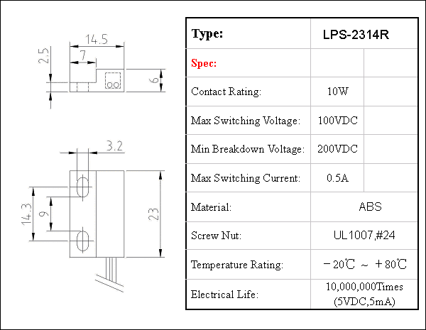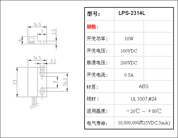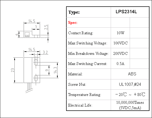 此系列有低电压常开型,单极双投型,常闭型3种选择,工作温度范围:-40~+80度。 ·经典设计,尺寸紧凑。 ·无待机功率消耗。 ·常开,常闭可选择. ·灵敏度,线长,端子客户可自定义。 ·密封设计,可工作于恶劣环境,性能稳定,寿命超长。 Sensor Body Material / A.B.S Filling / Epoxy Max Contact Rating / 10W Max Switching Voltage / 100 VDC Max Switching Current / 0.5A Min Breakdown Voltage / 220 VDC Max Carry Current / 1.0A Max Contact Resistance / 100 mΩ Min Insulation Resistance / 108 Ω Release Time / 0.1 ms Max Operate Time / 0.4 ms Max | | | | | | | 产品规格︰ | 23X14X6MM ·经典设计,尺寸紧凑 ·无待机功率消耗 ·常开,常闭可选择 ·灵敏度,线长,端子客户可自定义 ·密封设计,可工作于恶劣环境,性能稳定,寿命超长 | | | | 产品图片 |